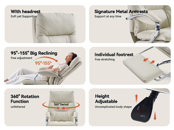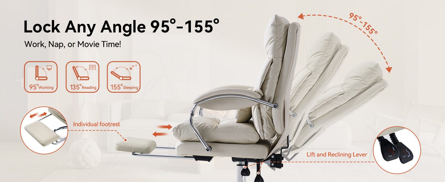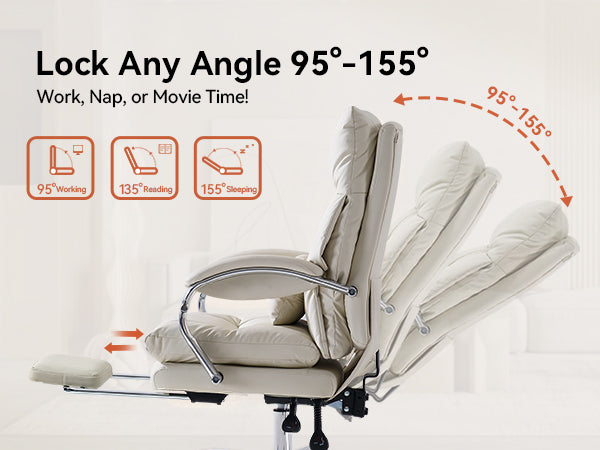 Reclines from 90°–155° with lockable positions and a retractable footrest for work or rest.