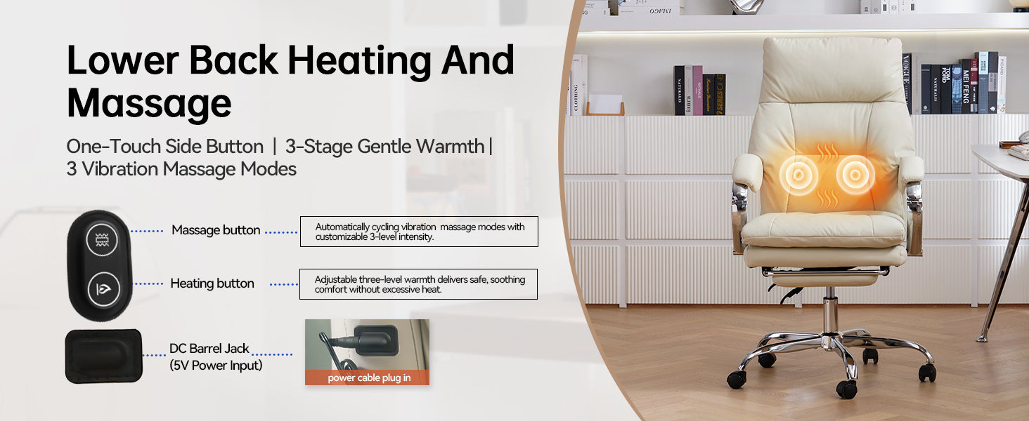 Built-in heat and massage lumbar cushion helps relieve lower-back fatigue during long sitting hours.