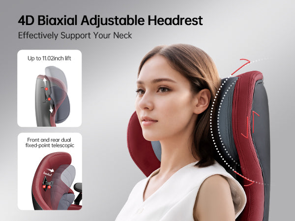 4D Ergo-Cloud Headrest — Filled with adaptive memory foam, it gently cradles your neck and moves with you. The semi-wrap design helps reduce up to 80% of cervical pressure for lasting comfort during long sessions.